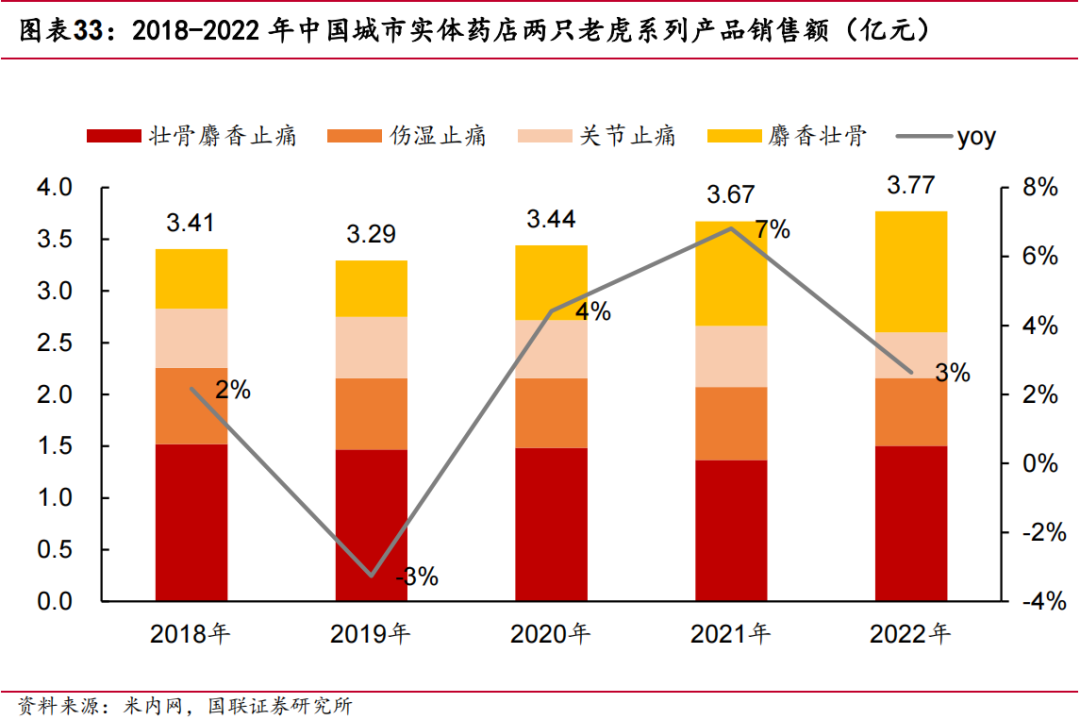 2018-2022年公司两只老虎系列在中国城市实体药店的销售额呈现稳定的增长态势。其中壮骨麝香止痛膏占比最大,2022年销售额占比达40%,麝香壮骨膏增速最快,2018-2022年CAGR达19%。