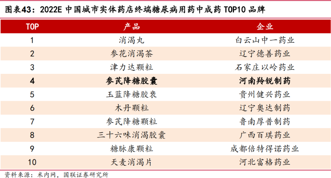 根据中国城市实体药店终端药品销售额统计口径,公司的参芪降糖胶囊在糖尿病用药中成药品牌中排名第4。
