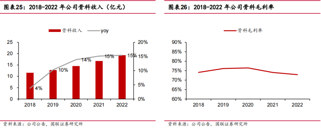 公司骨科类代表产品主要包括通络祛痛膏,活血消痛酊,两只老虎的壮骨麝香止痛膏、伤湿止痛膏、关节止痛膏,丹鹿通督片等。2022年公司骨科收入达19.32亿元,2018-2022年CAGR达14%,并且增速逐年加快。2018-2022年公司毛利率在75%左右,2021年和2022年有所下滑预计主要受疫情以及原材料价格上涨的影响。