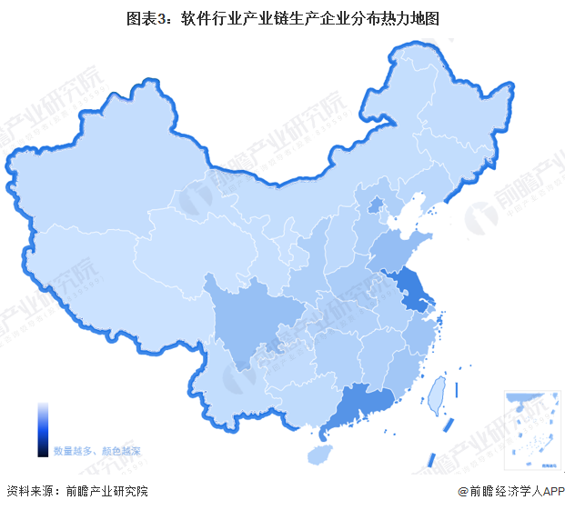 从我国软件行业产业链相关生产企业的分布热力地图来看,软件行业产业链企业多分布于东南沿海等经济较为发达的地区。此外,四川、陕西等地也有一定量的企业分布。