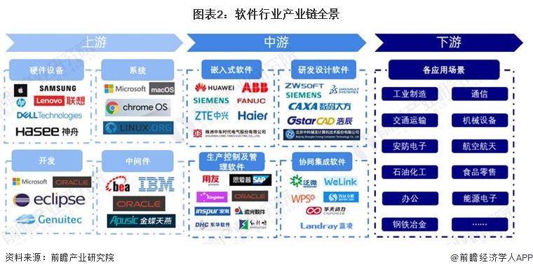 软件行业涉及环节较多,关系复杂,下游应用场景极多。简单来说,软件行业的中游主要为各类软件的研发具体过程包括了需求调研分析、概要设计、全面设计、编码、测试和交付等环节。产业链上游是软件研发所需的硬件与系统,下游是各类应用场景。
