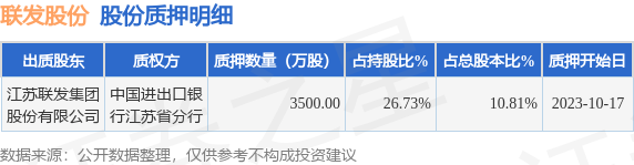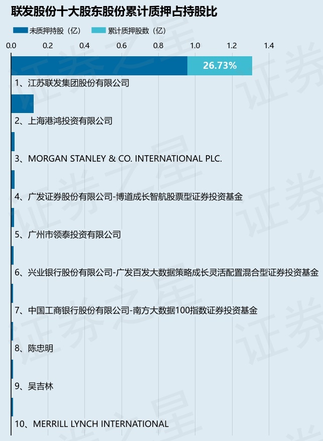 截止本公告日,股东江苏联发集团股份有限公司已累计质押股份3500.0万股,占其持股总数的26.73%。本次质押后联发股份十大股东的累计质押股份占持股比例见下图:
