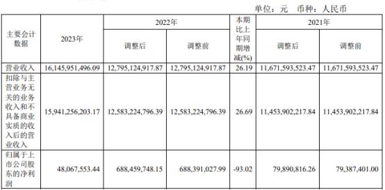 挖贝网4月26日,中船防务(600685)近日发布2023年年度报告,报告期内公司实现营业收入16,145,951,496.09元,同比增长26.19%;归属于上市公司股东的净利润48,067,553.44元,同比下滑93.02%。