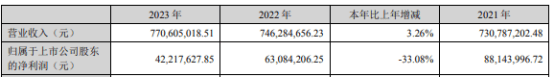 挖贝网4月26日,宏景科技(301396)近日发布2023年年度报告,报告期内公司实现营业收入770,605,018.51元,同比增长3.26%;归属于上市公司股东的净利润42,217,627.85元,同比下滑33.08%。