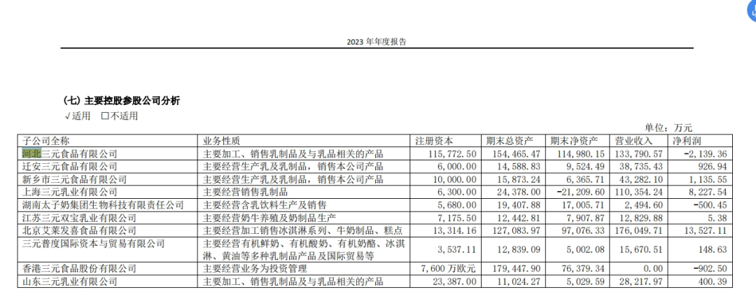 数据显示,河北三元食品有限公司(河北三元)2023年实现了营业收入约为13.38亿元,净利润却为负数,高达2139万元。而2022年,河北三元的营业收入约为13亿元,净利润则是正数,虽然金额不大,但也有573万左右。