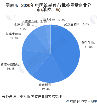 从总体竞争格局来看,2020年,我国流感疫苗批签发企业数量增至8家(2019年为6家),这主要是受新冠疫情的影响。其中,华兰生物占据着我国流感疫苗市场的主要份额,2020年的批签发量占比达到41.77%;其次是科兴生物和赛诺菲巴斯德,占比分别为19.37%和16.10%。