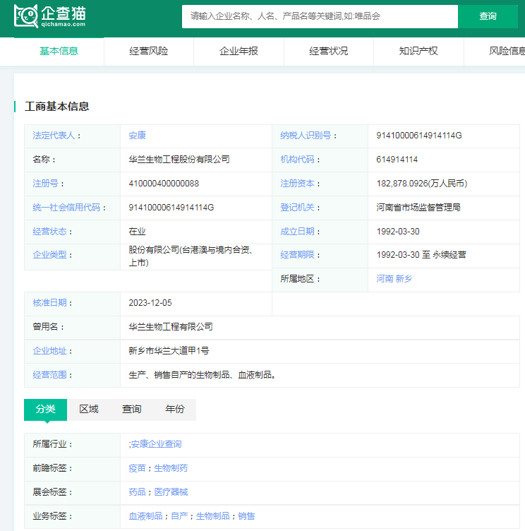 企查猫资料显示,华兰生物工程股份有限公司成立于1992年,注册资金为182,878.0926(万人民币)。血液制品是华兰生物的核心业务,其目前共有单采血浆站32家。