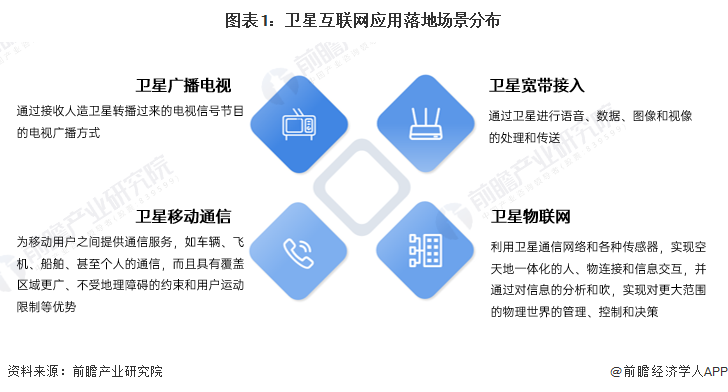 卫星互联网应用落地场景主要包括卫星广播电视、卫星宽带接入、卫星移动通信、卫星物联网。此外,卫星互联网在航空、海事、电力等领域均有应用。