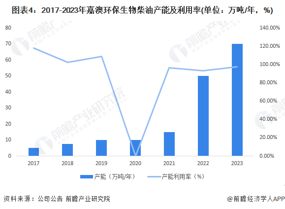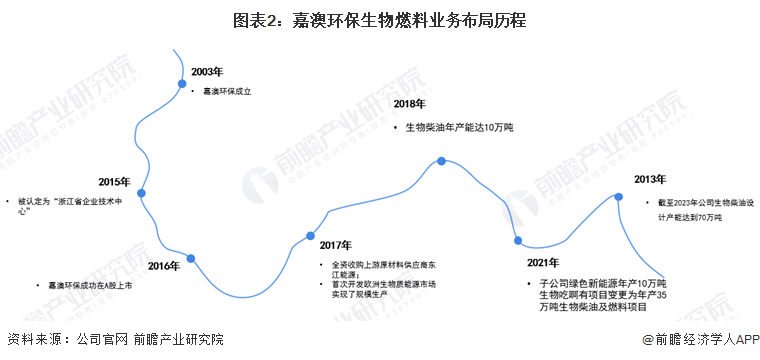 目前,嘉澳环保是我国长三角地区最具竞争力和发展前景的生物柴油生产企业。公司于2003年创立;2016年,公司在A股上市;2017年,公司首次开发欧洲生物质能源市场就实现了规模生产;2018年,公司生物柴油产能扩产至10万吨;2021年2月,公司与“壳牌贸易”正式签署约10.89亿元生物柴油出口长单销售合同;2021年8月,嘉澳环保子公司绿色新能源年产10万吨生物柴油项目变更为年产35万吨生物柴油及原料项目;截止2023年,公司生物柴油设计产能产能达到70万吨。