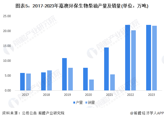 2017-2023年嘉澳环保生物柴油产销量均呈逐年增长趋势。2023年公司生物柴油实现产量22.09万吨,与2022年相比基本持平;实现销量21.78万吨,同比增长7.36%。整体来看,公司生物柴油产品产销基本维持平衡。