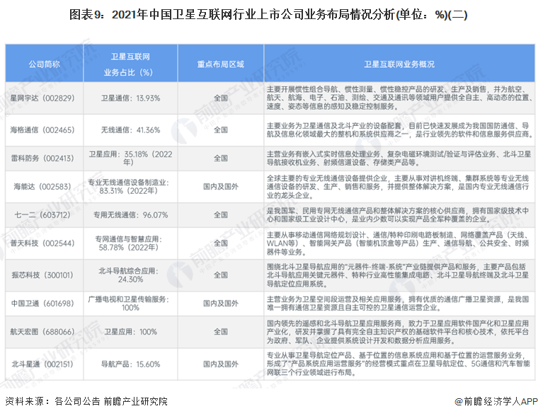 从目前我国卫星互联网行业的上市公司业务布局来看,大部分公司暂未将卫星互联网业务单独列出,而是划分在卫星应用、航天产品、卫星通信等业务中。从业务布局区域来看,除了海能达、中国卫通和北斗星通国外业务规模较大外,其他公司业务主要集中在国内。