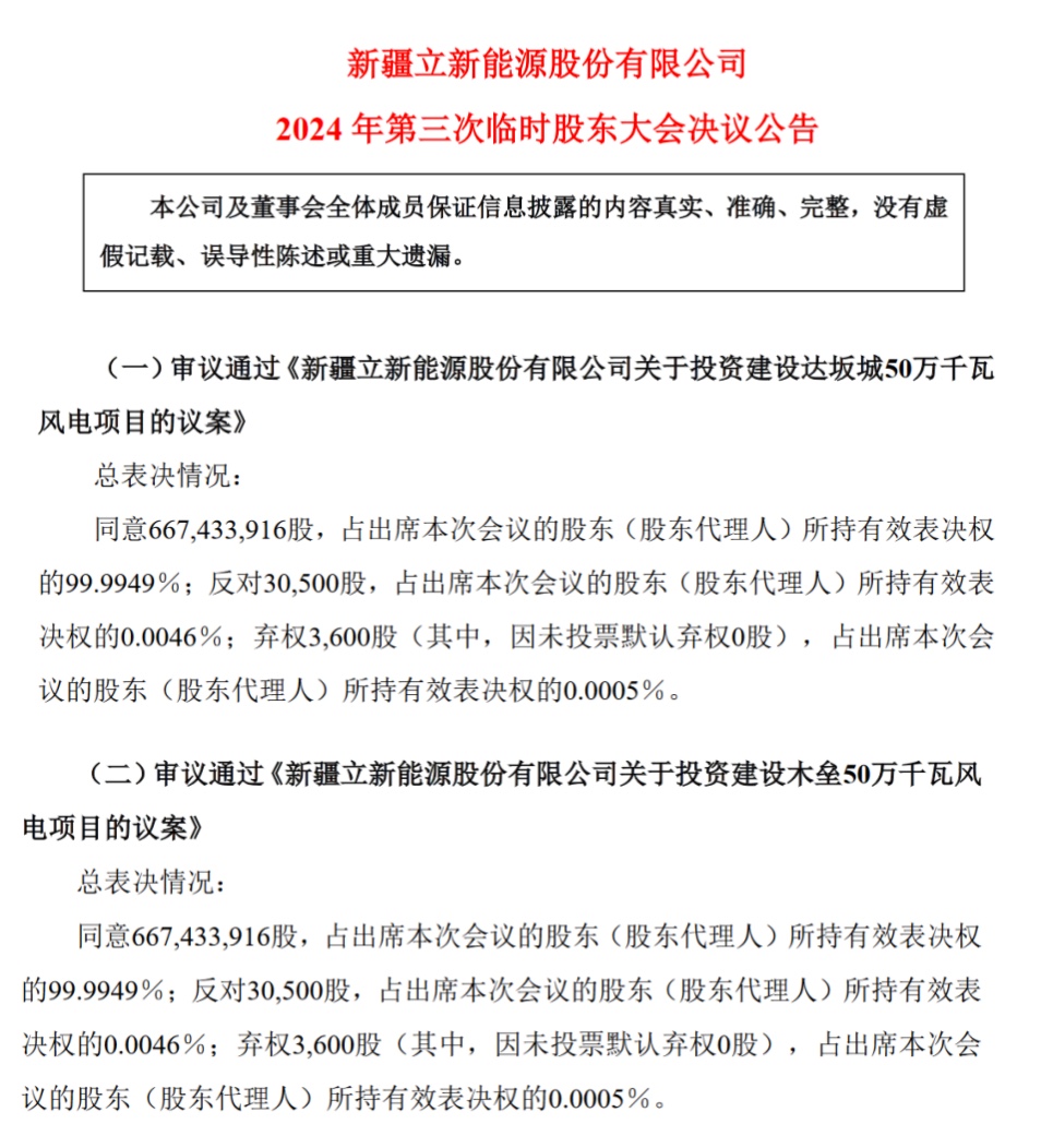 7月1日,新疆第一家以新能源发电为主业的A股上市公司立新能源(SZ:001258)召开2024年第三次临时股东大会,分别审议通过了《关于投资建设达坂城50万千瓦风电项目的议案》和《关于投资建设木垒50万千瓦风电项目的议案》。