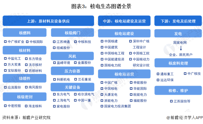 目前,核电产业链上游参与者类型广泛,核燃料环节的代表企业有中广核矿业、中核国际,核材料的代表企业有中盐化工、方大碳素、东方锆业、沃尔核材等,核岛关键设备的代表企业有东方电气、上海电气、佳电股份、中国一重等;核电产业链中游主要为核电站建设及运营方,其中核电站运营的代表企业有中国广核、中国核电、大唐发电等;核电产业链下游涉及发电及后处理,其中,核废料处理代表性企业包括通裕重工、中广核技、远达环保等。