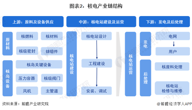 核电是我国能源供应体系的重要分支,也是新能源的重要组成部分。核电产业的上游包括核电设备、核燃料核材料的供应等;中游包括核电站的建设、运营;下游主要涉及发电、维修和后处理市场。