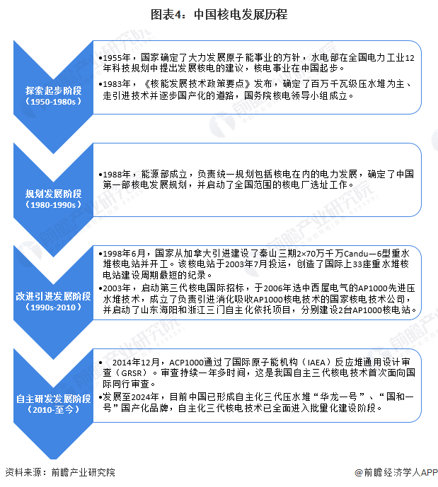 20世纪50年代中期,中国核电事业开始起步,依次经历了探索起步阶段、规划发展阶段、改进引进发展阶段,当前处于自主研发发展阶段,已形成多个自主化三代压水堆品牌且自主化三代核电技术已全面进入批量化建设阶段,处于世界领先水平。