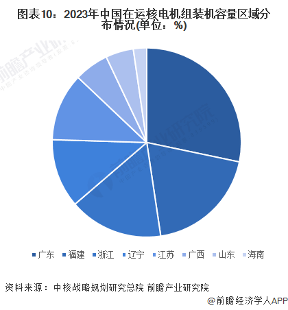 截至2023年年底,中国共有55座(不含台湾地区)核电机组在运,分布在辽宁、山东、江苏、浙江、福建、广东、广西、海南8个沿海省份。其中,广东、福建、浙江的在运核电机组装机容量位列前三名,占比分别为28%、19%、16%。
