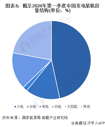 截至2024年第一季度,全国累计发电装机容量达到299371万千瓦,其中火电、太阳能、风电、水电的占比分别为47%、22%、15%、14%,而核电占比仅有2%。