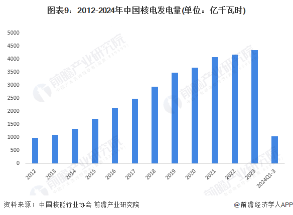 2012-2023年,中国核电发电量持续增长,2013年突破1000亿千瓦时,2017年突破2000亿千瓦时,2019年突破3000亿千瓦时,2021年突破4000亿千瓦时,2023年达到4334亿千瓦时。2024年第一季度,中国核电发电量为1040亿千瓦时。