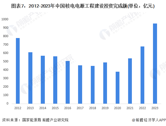 2012-2023年,中国核电电源工程建设投资完成额呈现先下降后上升的趋势,其中2020年降至379亿元,为近年来的最低水平,随后持续增长,2023年达到949亿元,为近十年来的最高水平。