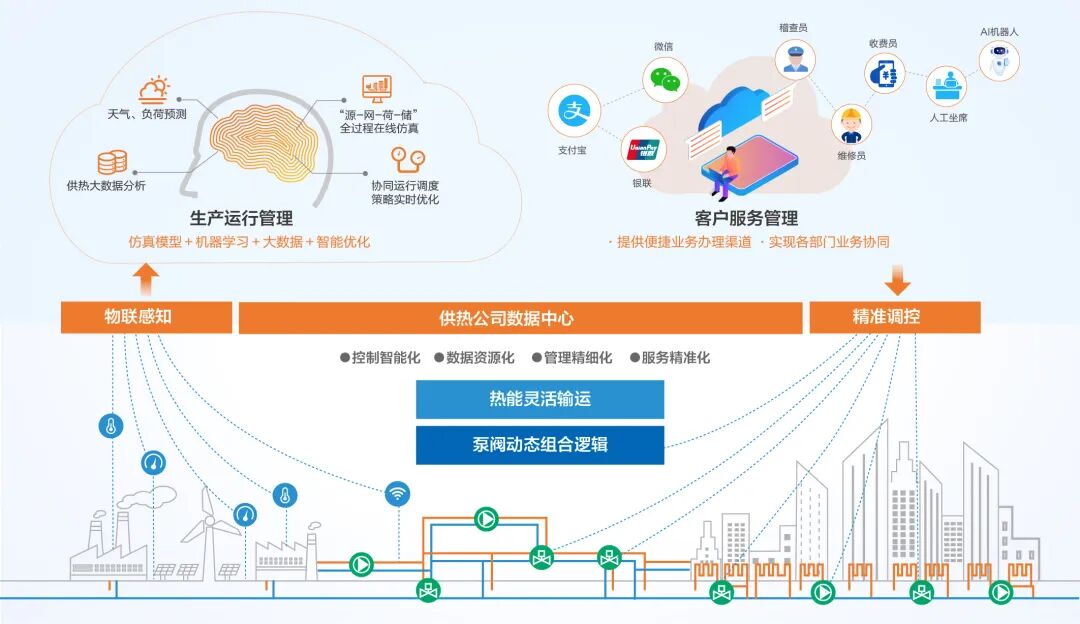 新天科技智慧供热一体化平台3.0,以统一数据服务为核心,采用微服务架构,实现了“数据融合、业务融合”的新型智慧供热管控模式。该平台深度融合物联网、大数据、云计算、数据可视化及AI人工智能等前沿技术,将“源-网-站-户”全链条要素紧密连接,形成了集数据采集、分析、诊断、预测、决策于一体的综合管理体系,为供热系统的生产、运营和服务流程提供了精细化、动态化的管理手段。
