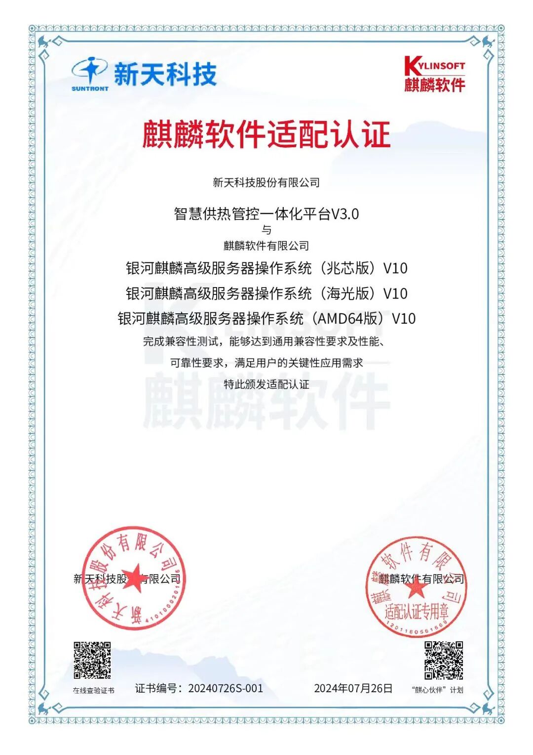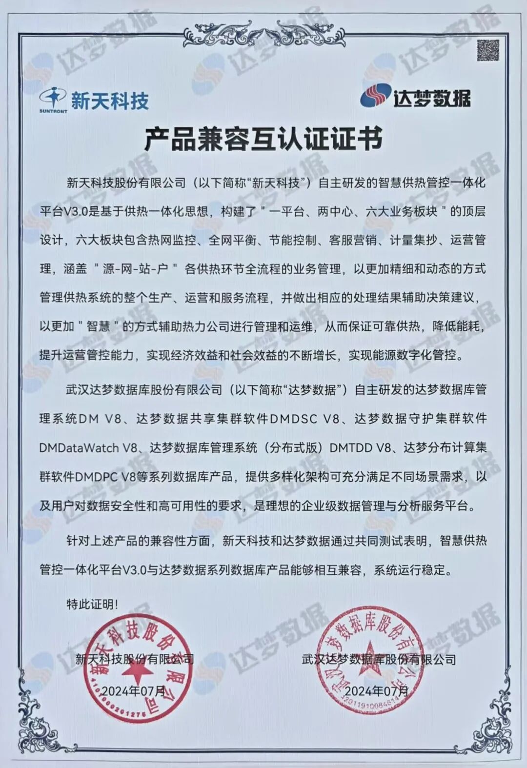 近日,新天科技自主研发的智慧供热一体化平台3.0成功完成了与达梦数据库管理系统的兼容性测试,并顺利通过了与银河麒麟高级服务器操作系统V10的适配互认证。标志着新天科技智慧供热一天化平台相关产品已在兼容性、安全性、稳定性方面得到专业认可,能够无缝对接信创国产化基础设施,为供热企业提供更为安全可靠、自主可控的技术支撑。