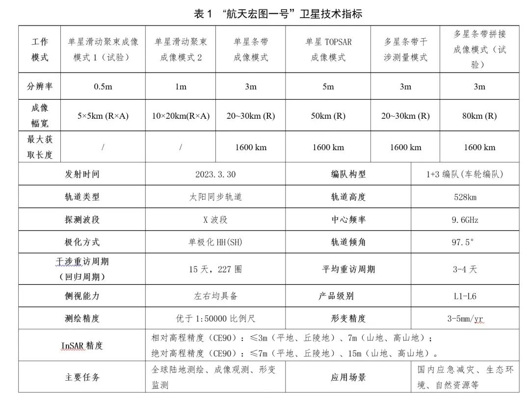 “航天宏图一号”卫星采用15天运行227圈的太阳同步回归冻结轨道,轨道高度为528km,采用“1+3”多基线干涉方案和四星共面运行方式,卫星最高成像分辨率优于0.5米(试验模式),最大幅宽可达80公里(试验模式),数字高程(DEM)测量精度优于1:50000比例尺,地表形变监测精度为3−5mm/年。与光学卫星相比,SAR卫星不受云雨等恶劣天气影响,可全天候进行采集。“航天宏图一号”卫星技术指标如表1所示,其中多星条带干涉测量模式和多星条带拼接成像模式(试验)是“航天宏图一号”卫星的独有模式。