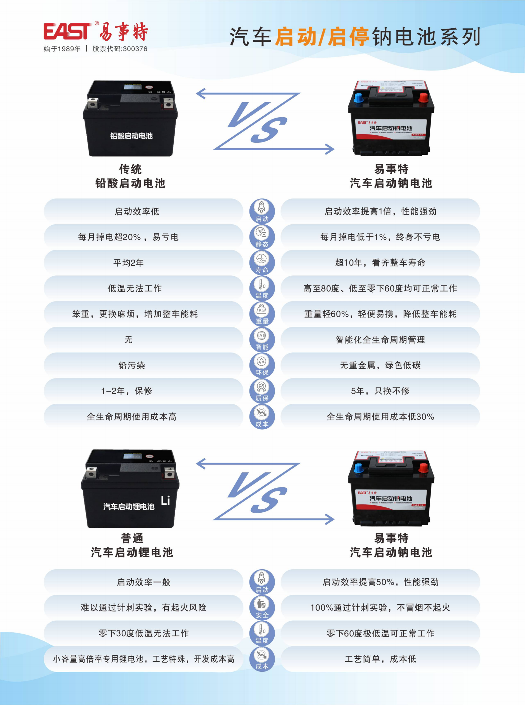 值此中华人民共和国成立75周年之际,易事特重磅发布汽车启动/启停钠电池系列,以其更高的安全性、更高的能量密度和更长的循环寿命等特性,有效解决长久以来车主在启动车辆时面临的众多困扰,标志着易事特在钠离子电池应用领域取得重大突破。