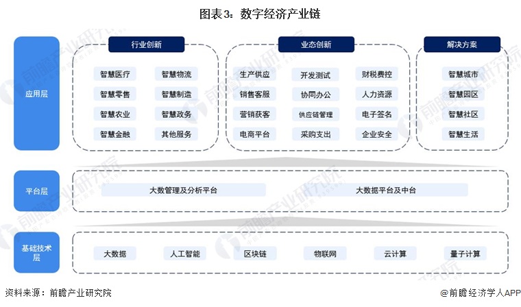 从产业链的角度来看,数字经济主要包括基础技术层、平台层以及应用层三大环节。基础技术层为构建数字经济体系提供了坚实的技术支撑,包括大数据、人工智能、区块链、物联网、云计算、量子计算等新一代互联网信息技术。平台层则是将这些技术进行集成化运用,实现特定功能转换的平台,如大数据管理及分析平台、大数据平台及中台等。而应用层则覆盖了居民生活、工作的方方面面,通过数字化升级,形成智慧产业,最终构成智慧城市、智慧园区、智慧社区、智慧生活等宏观的终端解决方案。