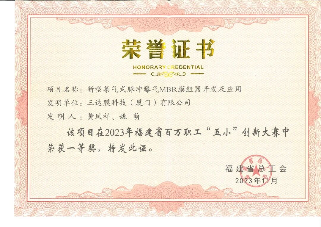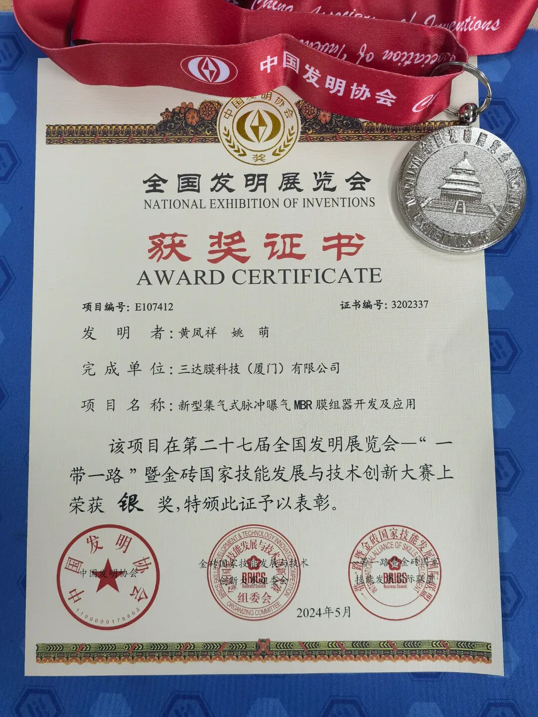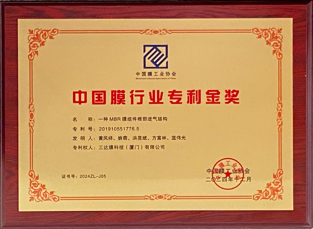 近日,中国膜工业协会第六届常务理事会第六次会议在南京召开,会上公布了2024年度“中国膜行业专利奖”获奖名单并举行颁奖仪式,三达膜“一种MBR膜组件根部进气结构”荣获中国膜行业专利金奖。