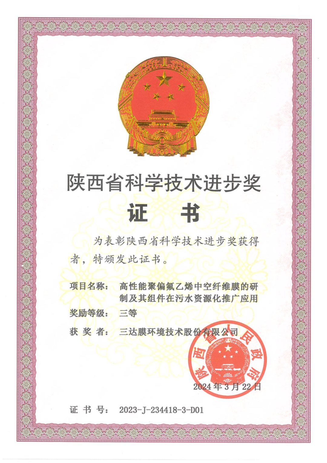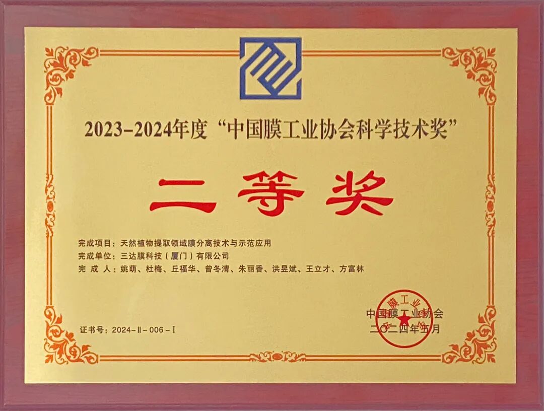 其中,三达膜“高性能聚偏氟乙烯中空纤维膜的研制及其组件在污水资源化推广应用”荣获“陕西省科学技术进步奖”三等奖;“特色茶香料靶向制备关键技术与产业化应用”荣获“厦门市科学技术进步奖”三等奖;“天然植物提取领域膜分离技术与示范应用荣获中国膜工业协会“科学技术奖”二等奖。