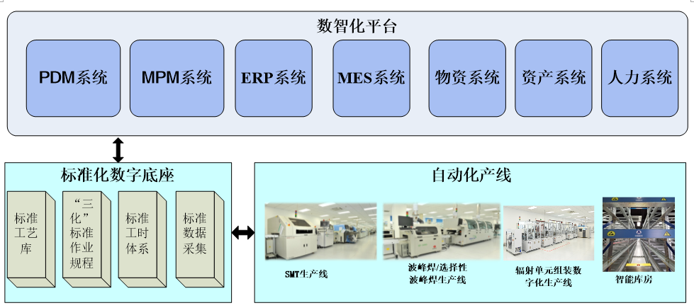 面向航天装备的规模化电装生产需求,上海无线电设备研究所通过搭建数智化平台、构建标准化数字底座、重塑自动化产线以及推进生产模式转型等多项举措,不断推动生产制造数智化转型升级,持续提升航天电装车间现场管理水平,有效支撑航天装备的跨越发展。在数智化平台搭建方面,车间打通设计制造一体化全流程系统数据流,打造数智化生产制造平台。在标准化数字底座构建方面,车间构建设计制造基础库、结构化工时体系以及实现过程数据实时采集,夯实流程优化根基。在自动化产线重塑方面,车间开展智能库房、SMT产线等设备建设优化。在推进生产模式转型方面,车间推动基于标准工序的生产组织模式变革、优化电装生产流程、优化电装生产布局。