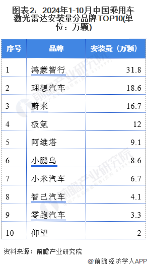 高阶智能驾驶技术的加速渗透,不仅推动了智能驾驶市场的快速发展,也带动激光雷达渗透率和装载数量上升,激光雷达正在加速“上车”。数据显示,2024年1-10月,中国乘用车激光雷达安装量排名前五的企业分别是鸿蒙智行、理想汽车、蔚来、极氪以及阿维塔,它们的安装量分别达到了31.8万颗、18.6万颗、16.7万颗、12.0万颗和9.1万颗。