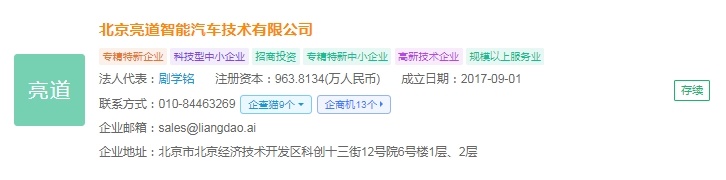 企查猫资料显示,北京亮道智能汽车技术有限公司(简称:亮道智能)成立于2017年,注册资金为963.8134(万人民币),是一家全球领先的技术型激光雷达系统供应商,专注于为行业客户提供全栈式激光雷达感知系统,包括车规级激光雷达硬件、感知功能开发、测试验证与数据服务。
