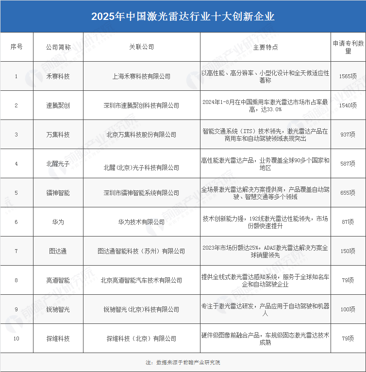 根据前瞻产业研究院的报告《2025-2030年中国激光雷达(LiDAR)行业市场前瞻与投资战略规划分析报告》显示,2025年中国已经涌现出了激光雷达行业十大创新企业。这些企业在技术创新、产品质量、成本控制等方面都取得了显著成果。