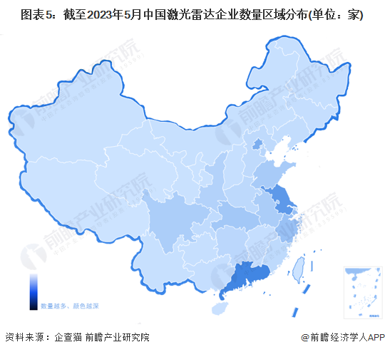 从企查猫以“激光雷达”为关键词进行精确搜索,得到激光雷达企业区域分布。从企业地区分布上来看,目前中国激光雷达企业主要分布在东南沿海地区,特别以广东和江苏为代表。截至2023年5月16日,广东共有相关激光雷达企业数500余家,江苏则有超过400家。