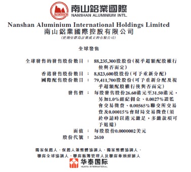 上证报中国证券网讯 3月17日,南山铝业国际控股有限公司(以下简称“南山铝业国际”)在港交所公告,公司拟全球发售8823.53万股股份。其中,公开发售股份为882.36万股,国际发售股份为7941.17万股。发售价为每股26.60港元至31.50港元,预计股份将于3月25日开始在港交所上市,华泰国际为独家保荐人。