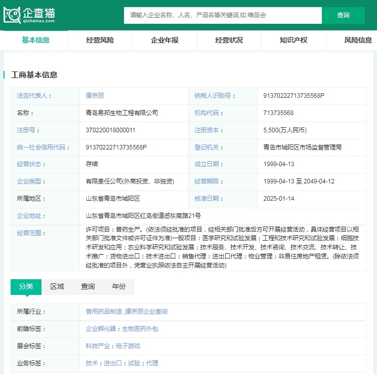 企查猫APP显示,青岛易邦生物工程有限公司(简称:易邦生物)成立于1999年4月13日,注册资金为5,500(万人民币),是一家专注于动物疫苗研发、生产、销售、服务及国际贸易的高新技术企业。主要业务包括预防、诊断、治疗用兽用生物制品的研发、生产与销售。产品涵盖禽用疫苗、灭活苗、冻干苗、猪用疫苗等多个领域。此外,公司还提供兽医技术服务、畜牧信息咨询服务,并从事货物和技术的进出口。