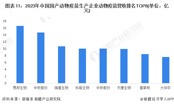 新猪派调研数据显示,2023年中国国产动物疫苗生产企业动物疫苗业务营收规模排名 TOP3的企业分别是易邦生物、中牧股份和瑞普生物,动物疫苗业务营收规模均在10亿元以上。其中,易邦生物排名第一。