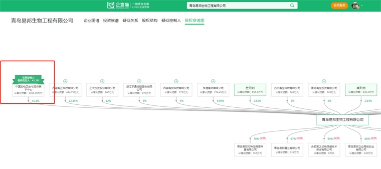 从企查猫股权穿透图可见,易邦生物由中国动物卫生与流行病学中心控股,股权占比41.1%。