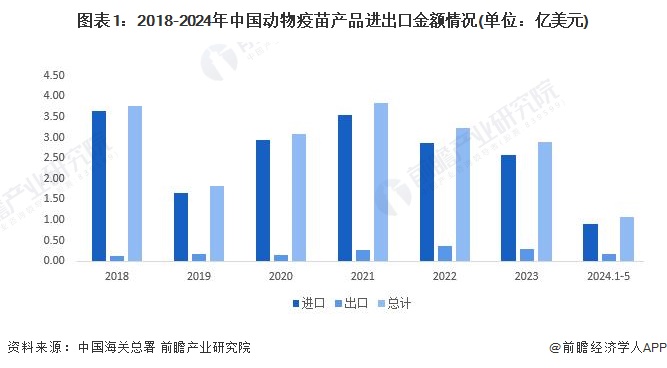 2018-2023年中国动物疫苗行业进口金额呈现波动变化趋势,出口金额呈现上升趋势,进出口总额波动变化,并长期保持贸易逆差。2023年进出口总额为2.89亿美元,同比下降10.9%。2024年1-5月,中国动物疫苗行业进出口总额为1.08亿美元。