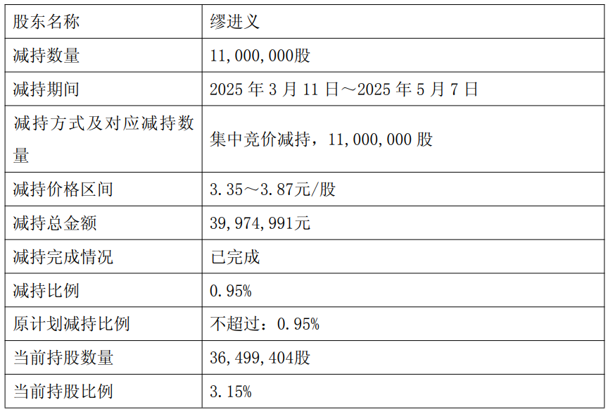 截至2025年5月7日,缪进义通过集中竞价方式减持公司股份11,000,000股,本次减持计划已实施完毕。