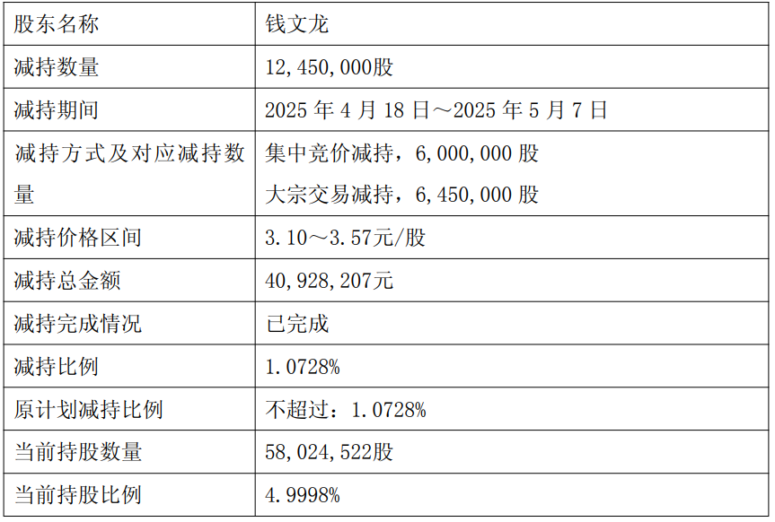 截至2025年5月7日,钱文龙通过集中竞价及大宗交易方式减持公司股份12,450,000股,本次减持计划已实施完毕。