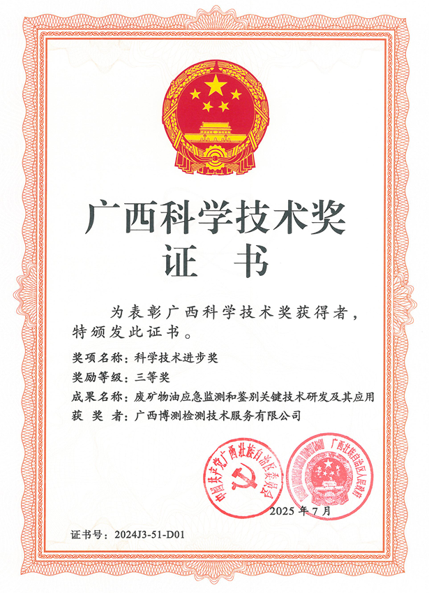 近日,2024年度广西科学技术奖揭晓。由博世科股份下属企业广西博测检测技术服务有限公司牵头(第一完成单位),联合广西壮族自治区生态环境监测中心(广西壮族自治区环境空气质量预报预警中心)、生态环境部华南环境科学研究所、广西壮族自治区产品质量检验研究院、广西壮族自治区环境应急与事故调查中心共同完成的 “废矿物油应急监测和鉴别关键技术研发及其应用”项目,荣获广西科学技术进步奖三等奖。该奖项体现了博测公司在技术创新与成果转化方面获得省级权威认可。