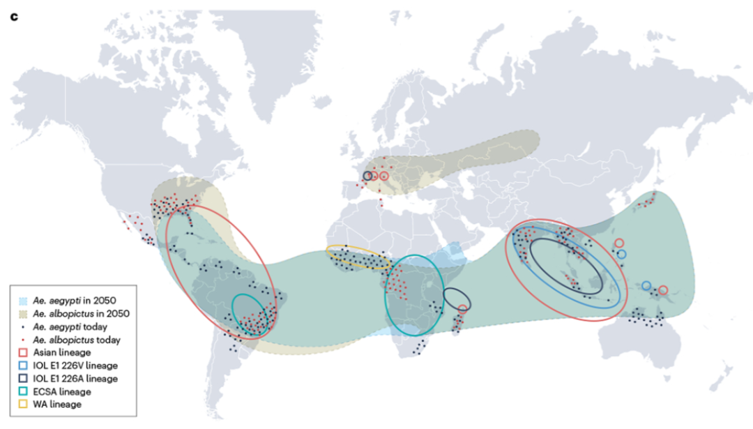 虚线图案表示当代存在伊蚊,预计到2050年的传播范围由彩色区域阴影表示