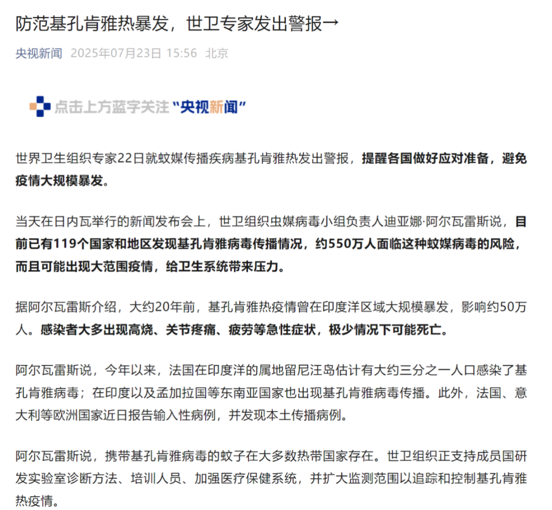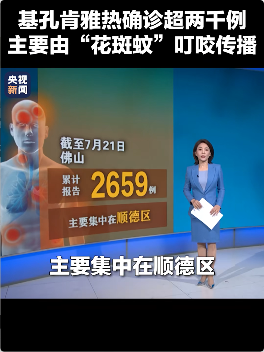2025年7月8日,佛山顺德区发现首例基孔肯雅热本土病例,疫情由境外输入病例引发。截至7月21日,累计确诊病例已达2659例,主要集中在乐从镇、北滘镇、陈村镇等地区。所有确诊病例均为轻症,但疫情的快速传播仍提醒我们必须高度重视这一新兴急性传染病,“四早”-早发现、早诊断、早隔离、早治疗,是疫情防控的关键。