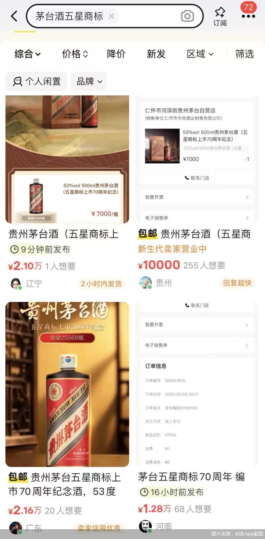 8月13日,北京商报记者登录闲鱼App查询发现,目前贵州茅台酒(五星商标上市70周年纪念)产品终端成交价主要集中于1万—2万元,而部分特定日期编码产品则一度被炒至约10万元。从官方申购价格7000元,到被炒至破万元甚至十万元,贵州茅台酒(五星商标上市70周年纪念)产品在上市6天之间,成交价格提升约42.86%—1328.57%。