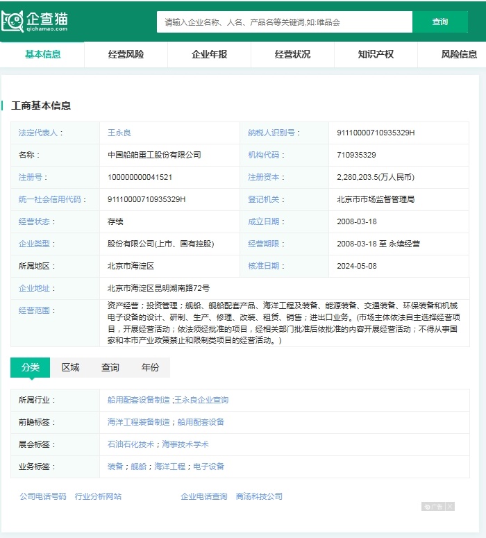 企查猫APP显示,中国重工成立于2008年3月18日,注册资金为2,280,203.5(万人民币),是全产业链的舰船研发设计制造上市公司,主要业务涵盖以下五大板块,海洋防务及海洋开发装备、海洋运输装备、深海装备及舰船修理改装、舰船配套及机电装备、战略新兴产业及其他。