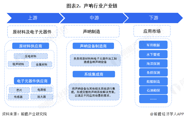 我国声呐行业产业链覆盖上游原材料、中游制造与集成、下游应用三大环节,各环节紧密协同,形成完整生态:上游主要包括电子元件、传感器、特种材料等供应商,这些原材料和零部件的质量直接影响声呐系统的性能。中游企业负责声呐系统的设计、研发与生产,涉及复杂的信号处理、声学设计和系统集成技术。下游应用广泛,涵盖军事领域的反潜、水雷战,以及民用的海洋资源勘探、渔业捕捞、水下工程检测等。