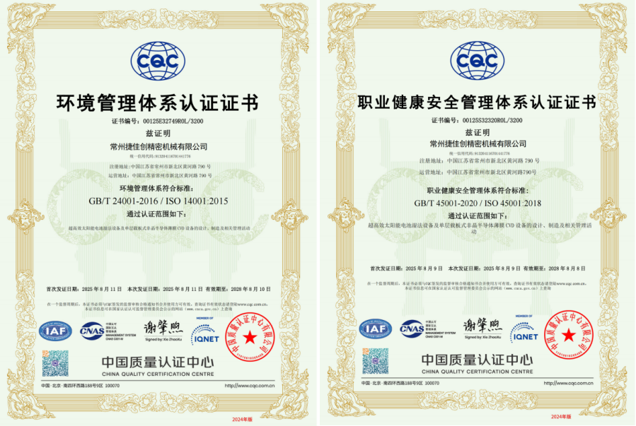 近日,公司子公司常州捷佳创精密机械有限公司(以下简称“常州捷佳创”)顺利通过由中国质量认证中心对环境与职业健康安全管理体系的认证;依据GB/T24001-2016/ISO 14001:2015、GB/T45001-2020/ISO 45001:2018及相关法律法规要求进行的外部认证审核,获颁《环境管理体系认证证书》、《职业健康安全管理体系认证证书》。