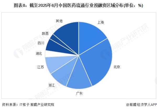 根据企业投融资目的地来看,目前行业内资金主要流向北京,占比27%。其次是上海,占比16%,广东和浙江占比分别为13%和10%,江苏占比8%。这些地区经济发达,企业众多,药械药品流通需求较大,交通设施完善,仓储冷链配备较好,因此医药流通投资项目较多。
